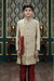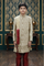 Boys Sherwani & Pant made from print silk fabric by Paaie LLC. This Sherwani has a front button closure placket, full sleeves and side pockets for increased functionality, suitable for festivals and party wear.
