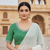 Voyage through the world of fashion by wearing this delicate look from Paaie. The Green blouse is handcrafted in pure handwoven tusser silk base with a flattering round neckline and short sleeves above elbow. The neckline and sleeves are accentuated with hand embroidery in silver. Style this with chunky earrings, juttis and a small handbag.