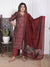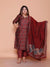 Elevate your ethnic wardrobe with this sophisticated maroon party wear suit set, crafted from premium Roman silk for a luxurious drape and refined finish. The ensemble features an intricately printed kurta paired with coordinating pants and dupatta, offering a complete, coordinated look for festive occasions and celebrations. Roman silk's natural sheen and breathable properties ensure comfort throughout your event while maintaining an elegant appearance. The rich maroon hue complements various skin tones and pairs effortlessly with traditional jewelry. Perfect for weddings, festivals, and formal gatherings, this three-piece set delivers both style and versatility without requiring additional styling pieces.