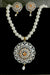 This is a simple and sleek American Diamond and Semi-Precious Ruby Pearl pendant set. The pendant is in a circular shape with a floral design made from small semi-precious stones in the middle. The strand of pearls is pure white. This set will go with all of your outfits, traditional and modern.