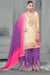 Crafted from premium Chinon fabric, this elegant suit features intricate embroidery that enhances its refined appeal. The set includes a matching sharara and dupatta, offering a harmonious blend of traditional style and modern comfort. Ideal for special occasions, this ensemble promises both sophistication and ease, making it a distinguished addition to your wardrobe.